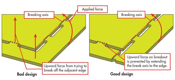 五孔穿孔圖案是可分離凸耳的標準配置。在限制走線或組件邊緣間隙以及必須將凸片放置在懸垂零件下方的情況下,可以使用用于孔口的三孔圖案。三孔突圍要弱得多,與五孔突圍的間距必須更近。