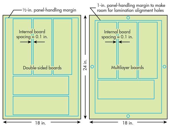 您應該設計PCB陣列,以確保在整個過程中運行多個電路板的好處,同時從PCB制造商的標準處理面板中獲得上限數(shù)量的電路板。為了便于將來的PCB突破而對陣列進行的每一次切割都會在一定程度上削弱面板的性能。因此,還必須限制陣列的尺寸,以防止PCB陣列變?nèi)?,這可能會導致在放置和放置機器中產(chǎn)生振動并在波峰焊接機中引起下垂。典型的PCB制造商使用自己選擇的標準面板尺寸,通常為18×24英寸。他們需要1/2英寸的尺寸。處理雙面面板和1英寸面板時的周界間隙。處理多層PCB時的間隙。在18-×24-in。面板,這意味著雙面和16-×22英寸的可用面板空間為17×23英寸。英寸的多層板空間。他們將在板陣列之間需要約0.1英寸的布線空間,因此這也是無法使用的面板空間??梢允褂迷S多“面板計算器”來幫助您從制造商的標準面板上獲得上限的板數(shù)。但是,如果您沒有獲得70%的使用率,則應該更加努力(圖1)。