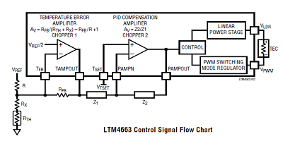 LTM4663模塊基于Peltier效應(yīng)針對(duì)熱電冷卻/加熱子系統(tǒng),提供了實(shí)現(xiàn)溫度控制環(huán)路以實(shí)現(xiàn)精確熱穩(wěn)定所需的功能。