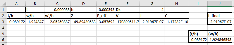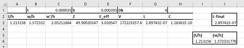 在第一個示例中,我將允許銅的重量和層厚(即,比率(t / h)的值)為優(yōu)化變量。基板介電常數(shù)為Dk =4。對于上面列出的限制,我選擇a = 5b =2。對于我的結果,我發(fā)現(xiàn)(w / h= 1.572332 時,最小電感為290 nH /米。(t / h)= 1.213156。