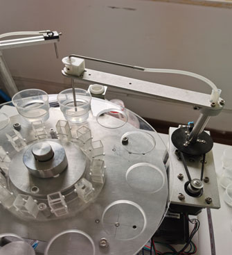 四、稱量完成,圓盤開始轉(zhuǎn)動(dòng)(3號電機(jī)動(dòng)作),第一個(gè)樣本位轉(zhuǎn)動(dòng)至加樣針的位置,開始加樣液(加樣量根據(jù)樣本重量決定,0.1g的樣本對應(yīng)0.5ml的樣液)(6號電機(jī)動(dòng)作)。